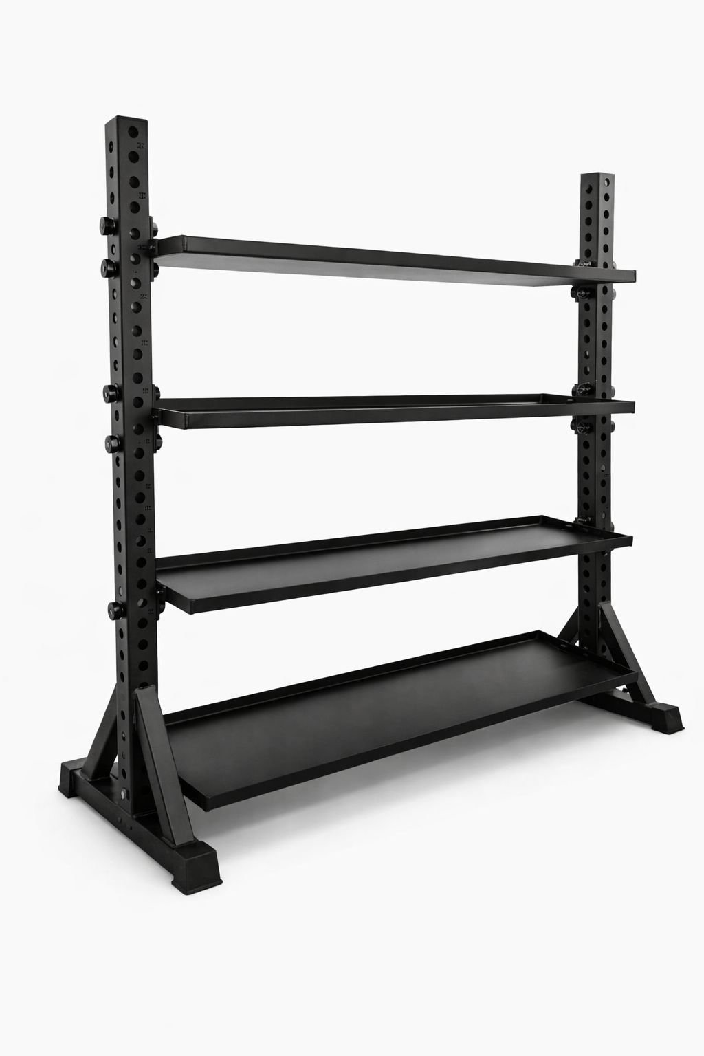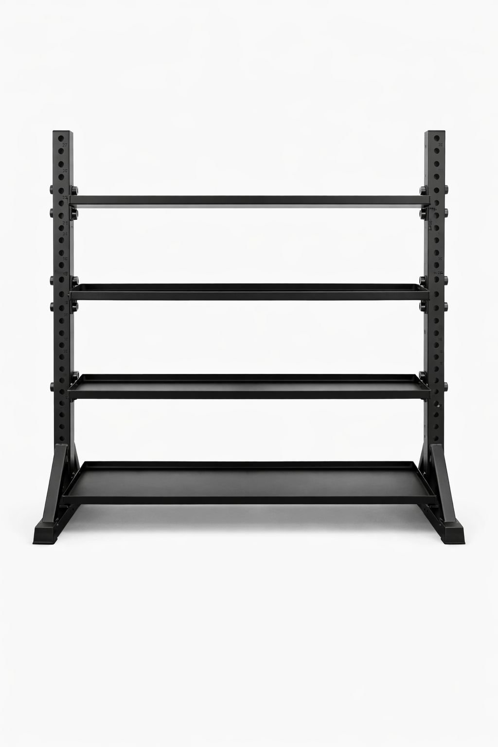 - En los dos estantes inferiores almacena mancuernas hexagonales, pesas rusas